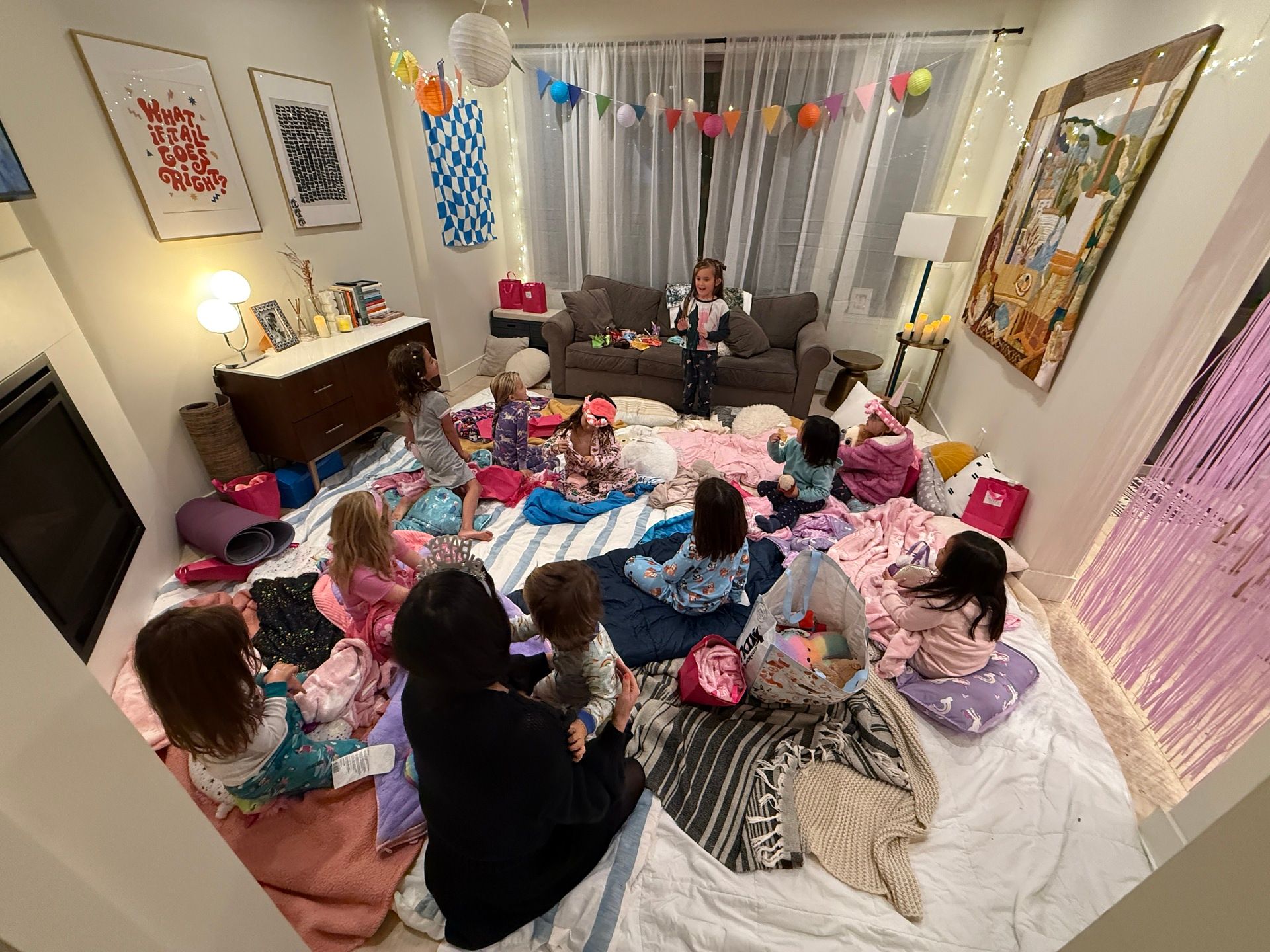 Last night we threw her an “almost sleepover party.” 5pm to 9pm. Ten kindergarten girls in pajamas, sleeping bags, stuffies, and full chaos mode.